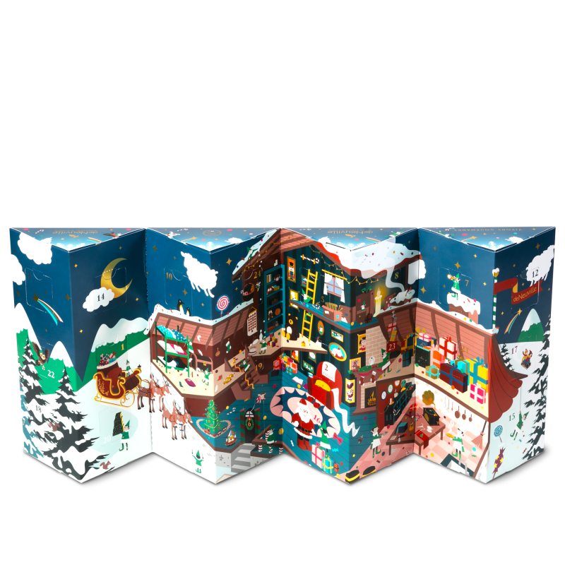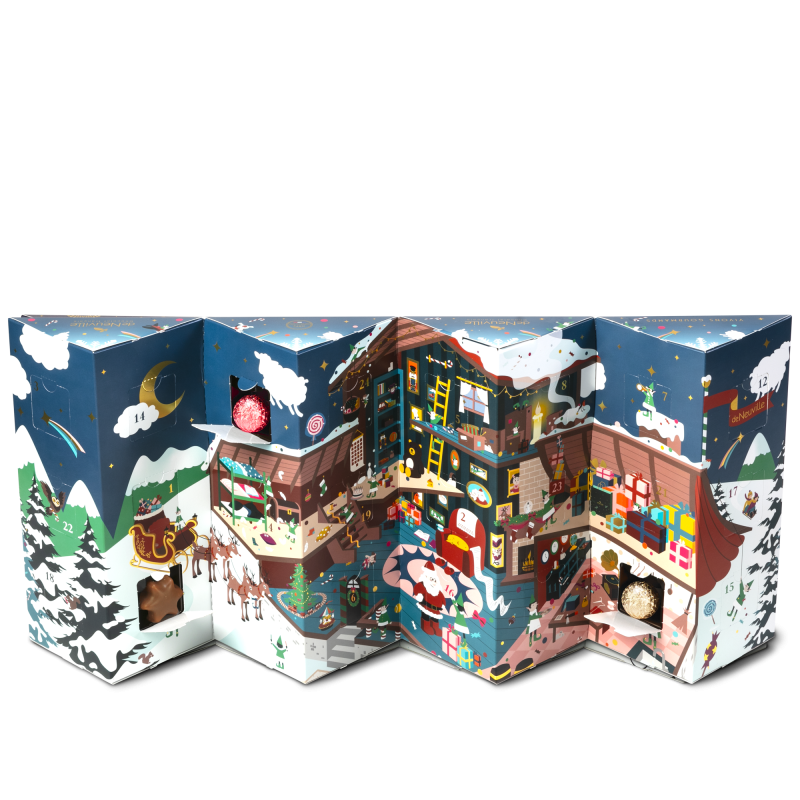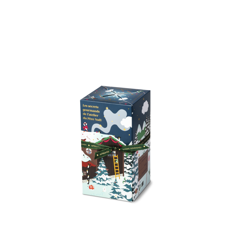 Cette année, notre calendrier de l’Avent 2025 pour enfants est étincelant ! C’est l’euphorie de la nuit de Noël ! Les derniers préparatifs sont en cours et les lutins s’activent pour rendre ce Noël magique et gâter les enfants. Un univers immersif, entre gourmandise et scènes amusantes. À l’intérieur du calendrier, plongé au cœur de la forêt, le chalet du Père Noël se dévoile. Les rennes s’apprêtent à s’envoler, tirant le traîneau chargé de surprises et de cadeaux. Un univers original, ludique et festif où se glissent de délicieuses gourmandises adaptées aux enfants !