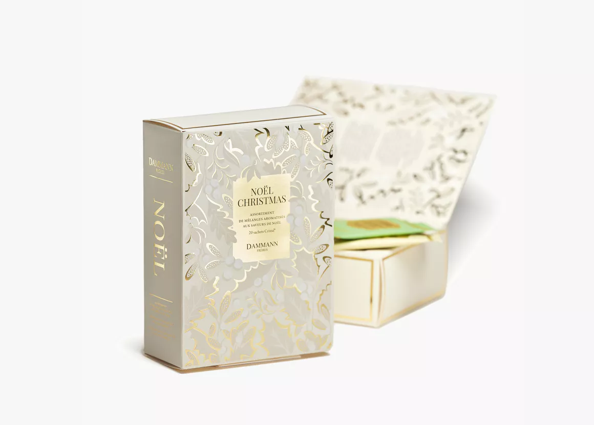 Un décor de feuillage d’hiver habille avec élégance et délicatesse ce coffret contenant 5 mélanges aux saveurs de Noël.20 sachets Cristal® enveloppés de thés ou d’infusions de Noël :Thé noir Christmas Tea – 4 sachets ;Thé Vert Christmas Tea Vert – 4 sachets ;Thé blanc Christmas Tea Blanc – 4 sachets ;Rooibos de Noël – 4 sachets ;Infusion de Noël – 4 sachets.