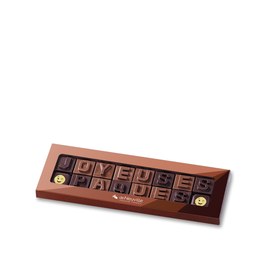 Souhaitez de joyeuses Pâques de manière originale à vos proches, grâce à ce délicieux message en chocolat. Ces savoureuses lettres en chocolat noir et lait, pur beurre de cacao, sauront ravir les plus gourmands.