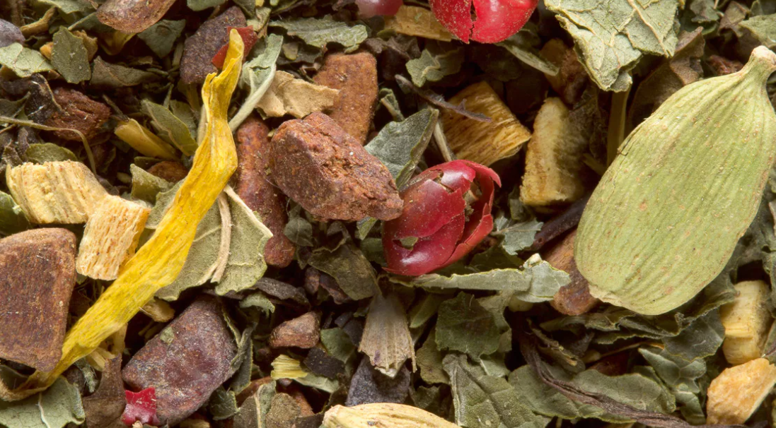 Cannelle, mélisse, fèves de cacao, cardamome, réglisse, gingembre, baies roses, arôme chocolat, clou de girofle, pétales de fleur, poivre noir. Avertissement : cette tisane contient de la réglisse, les personnes souffrant d’hypertension doivent éviter toute consommation excessive.
